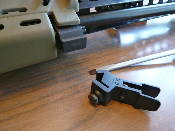 左右に見えるダイヤルを回す事で上下調整ができますが、後ろ側にある固定ピンを押しながらでないと回せず、またこのピンを押すのに工具を要するのであまり使いやすくはありません。フロントサイトはM16/M4のようなピンではなく板状になっています。