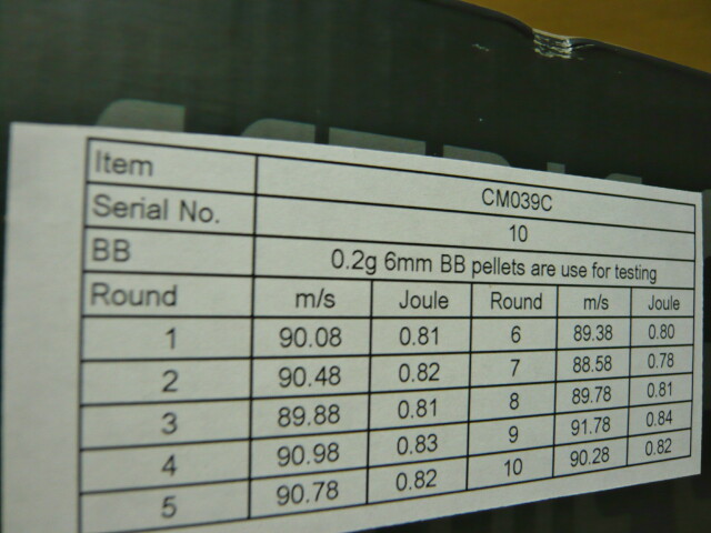 初速チェック表のようなものが外箱側面に貼ってあります。タボールにも付いていましたが、買った店が同じだからなのか中華電動はみんなこうなのかは不明。ここを見る限りタボールと同程度の初速の模様。
