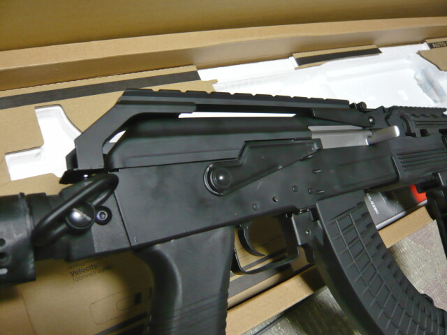 レシーバー付近。この銃の最大の特色であろうトップレイルが特徴的。ストック付け根右側面に剛性の高そうなスイベルが増設されていますが、レシーバー後方左側に元々あるスイベルも残されています。塗装はつや消し黒ですが風合いはちょっと雑味がありマルイの次世代AKS74Uなんかに較べると全体的に汚い傾向にありますが、小奇麗なよりもむしろこの方がAKらしいか。