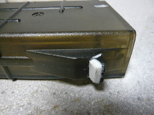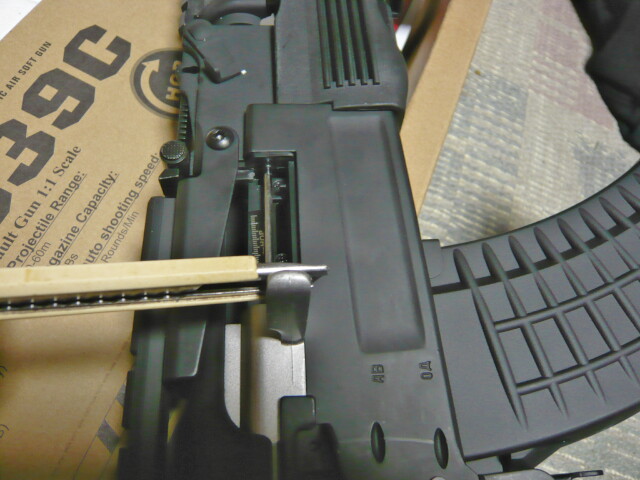 マガジンキャッチに掛かるラッチの下側を削っていたのでプラ板を貼って修復。こんなに削ったっけ・・・ってくらい重ね(0.5mmプラ板4枚分)、流し込み接着剤とアロンアルファでガッチリと固めます。AK47タクティカルに装着しても結局装弾ストップし、マガジンの下側ををグイッと引くとチャッと音がして再装弾、2~3発撃つとまたストップという症状だったので装弾ストップしないようになるまで盛った結果こうなりました。マガジンの装着時もマガジン上前側を銃へ掛けてからマガジン下側をエイヤッと手前に引っ張ってマガジンキャッチに掛ける必要があります。元々こうなのかなぁ・・・