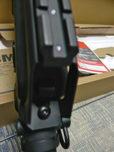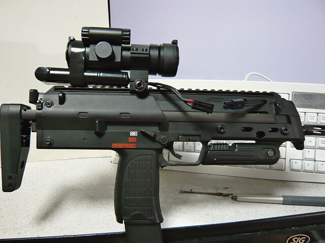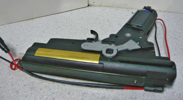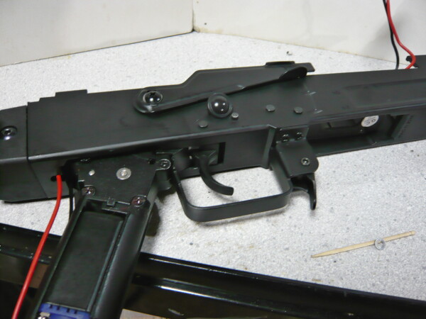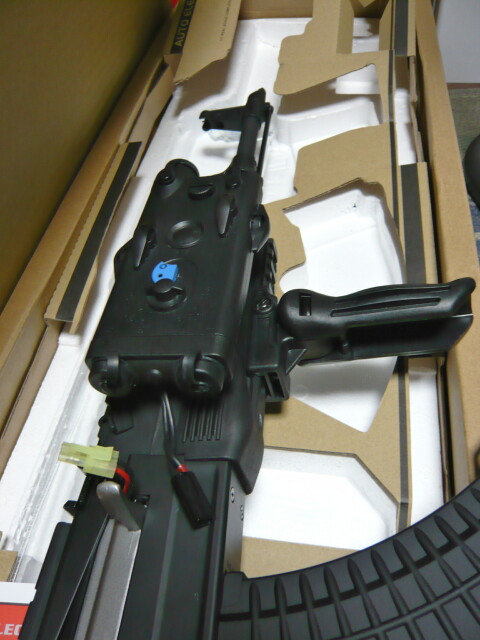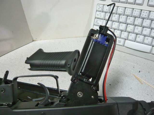 仕方ないのでミニSバッテリーを浮いていたAN/PEQ-2タイプバッテリーボックスに入れて装着。電気が来たので空撃ちしてみると、何か独特な作動音がします。セミオートではキョとドッとジャッが合わさったような音で結構切れが良く、フルオートではヘヒャヒャヒャヒャといった感じの独特な音がします。