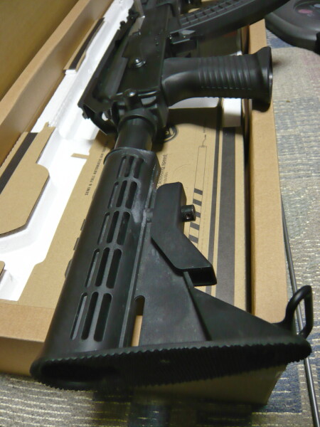 ストックはM4タイプのストックチューブにブッシュマスタータイプの伸縮ストック。ちょっと白く汚いですが拭いてもまた乾くと白く浮いてくるので材質的なものかと。箱出しだとストックチューブ付け根のリングが緩まっててガタついていますが手で回して締めてやればガッチリします。その後ろのストックはややカタカタしていますがこれはまあ仕様です・・・伸縮は6ポジションでロックはカッチリしていて安心。