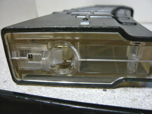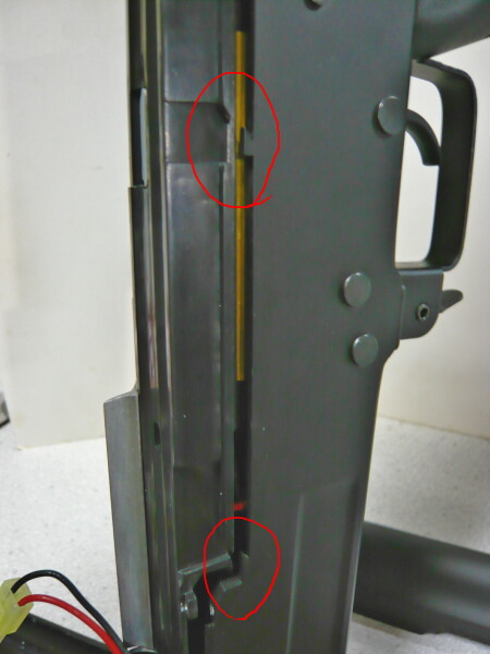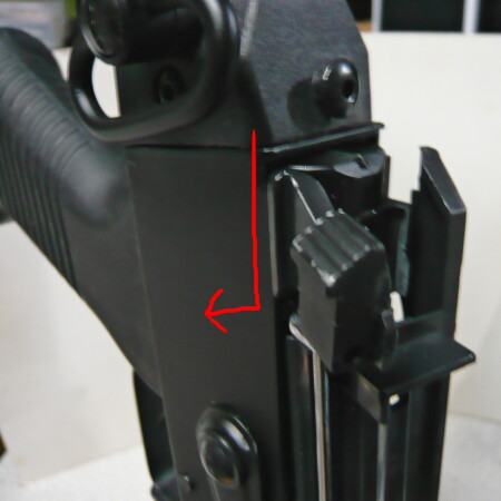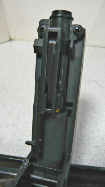 リップ部分。弾を止める部分を試行錯誤の末削りすぎて弾が止まらなくなってしまったので0.5mmプラ板を瞬着で貼って補修しています。チャンバーが刺さるとストッパーが開放方向へ押されて弾がチャンバーに送られる構造ですが、このストッパーの厚みが増しチャンバーが刺さった時にストッパーが大きく動くようになったのでここでも給弾ストップしにくくなったのに貢献しているはず。