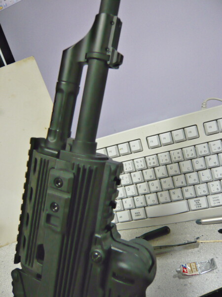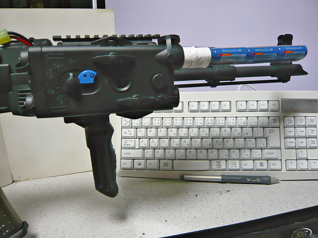 マルイのバレルマウントレールショートを取り付け、その下にバッテリーボックスを取り付けたところ。コード届かないや・・・多弾ショートマグの良い所はこうやって机の上に真っ直ぐ置けるところ・・・