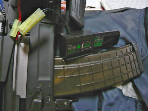 マルイのコンパクト電動用のマイクロバッテリーEXを放電器アダプターを介して接続。何かこのままレシーバーの横にくくりつけて使っても良さそうなくらいコンパクト。でも7.2vで500mAhしかないしNi-Cdだし・・・