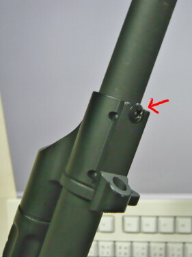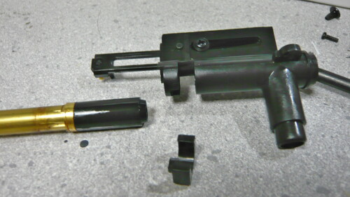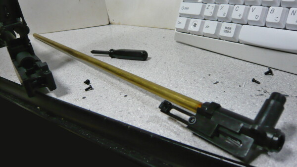 ハンドガードが外れたところ。アウターバレルは割りとキズには強いようですが、フリーになった金具をカラカラ前後させてしまうとうっとおしいのでハンドガードを外したらガスブロックを定位置に組んで下のネジを軽く締めておくと良いでしょう。というか、この下のネジ失くすと致命的なので・・・