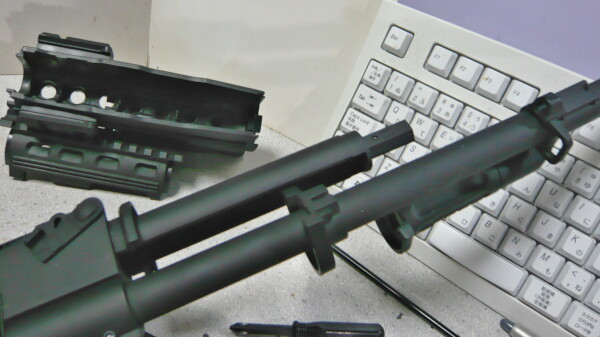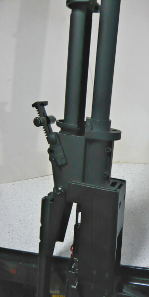 ハンドガードは上下左右にレイルのある汎用性の高いもので、色がマルゼンCA870のレシーバーみたいな繊維感のある黒に近いダークグレーをしており、感触もソリッドな感じで剛性感もあります。ただ横のレイルだけは溝が一本しかなく、溝の幅もやや狭いのでカッターで削って拡げる必要があります。下面レイルには折りたたみ式のフォアグリップが標準装備されていますが、見た目より幅があり後面は肉抜きされているのであまり握りやすくは無く、折りたたみの軸がやたらガタガタなので使用感が悪くこんなもん外して別のフォアグリップに換えた方がいいかも。