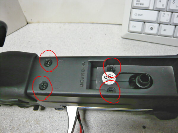 メカボックス左右を留めているネジを4本抜きます。前端上側を短いネジ、前端下側を中くらいの長さのネジ、トリガー後ろとメカボックス後端に長いネジ。