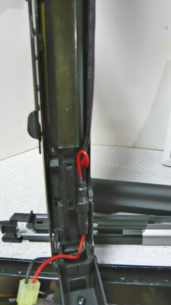やはり入りません・・・長さはリヤサイト下を通ってハンドガード内に入る形になるのですが、銃側から出ている配線が短くてコネクターを空きスペースに逃がすことが出来ませんし、何よりバッテリーが太くてスペースギリギリすぎるのでタンジェントサイトのスプリングの端に当たってリヤサイト下のスペースへ通す事ができませんでした。そもそもこのバッテリー、セルの大きさがラージバッテリーくらいあるような・・・