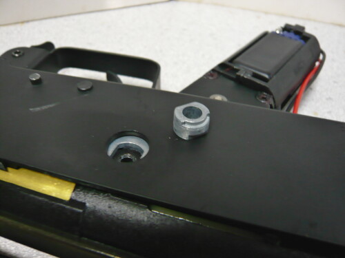 そしてメカボックスに取り付いているプラスネジの頭のようなメタル軸受け。これは独自のもののようでマルイ純正はプラ製なので一応強化されていますが、メカボックスの異音の発生源でもあります。径は7mmかな?プラス状の溝にグリスが入り油切れ防止をする構造ですが、ガタの原因でもあるので一長一短。