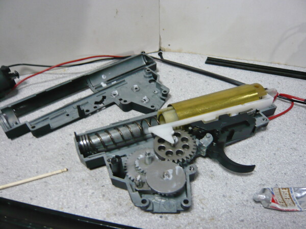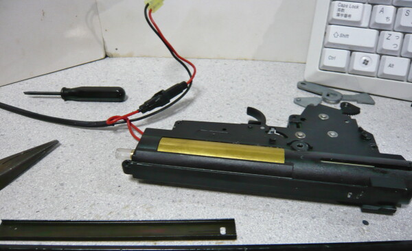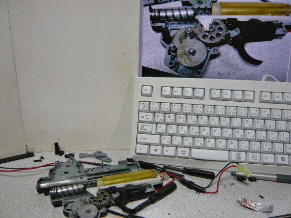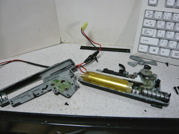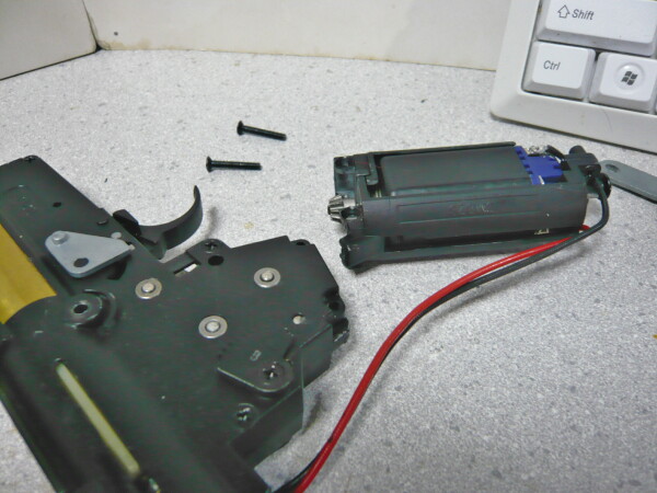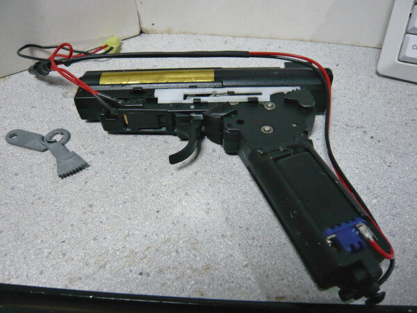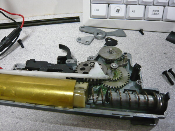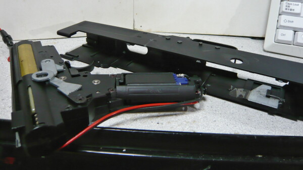 そーっとマイナスドライバーでコジコジしてメカボックスを開きます。フルオートで撃った後だとスプリングが圧縮されている事があるので注意。撃つのをやめる時かならずセミオートで1発空撃ちする習慣をつけておかないとこういう時にも危険な目に遭ったりします(最悪メカボックスを開けた時にパーツが弾けて爆発に近い事が起きます・・)。出来れば念のためモーターホルダーを外した時点で下から逆転防止ラッチを針金などで引っ張ってスプリングをフリーにしておくとなお良いでしょう。