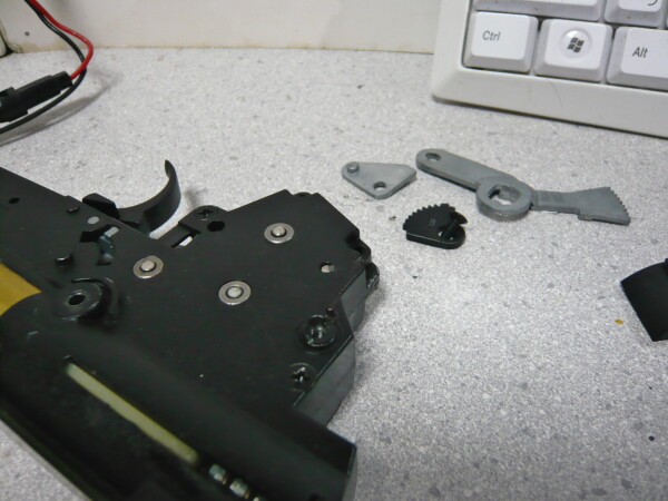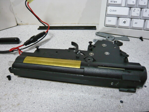 トリガー後ろにあるカバーがひん曲がって中身が露出していました。このパーツはメカボックスをレシーバーに収める時にレシーバーの端に引っ掛かりやすく、この個体はすでにひん曲がっていましたが後からバラして再び組んでも結局ひん曲がる運命にある気がします。はめ込まれてるだけなのでとりあえず外します。
