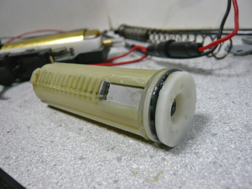 ピストン。下側の歯車は一番前の1枚だけが金属製で、ピストンヘッド方向へ向かって強化されています。マルイ純正のピストンと同様。ここはセクターギヤがピストンを後退させ最後に開放する部分。つまり最もスプリングの反発力が掛かる位置になります。ここが欠けてしまうとピストンの後退量が短くなってしまうのでパワーダウンに繋がります。またスプリング長が足りない場合ピストンの前進速度が低くなり、その上で高電圧バッテリーなどでハイサイクル化した場合に開放してまた一回転してきたセクターギヤが前進しきらないピストンのギヤへぶつかる事になります。社外品ではここの後ろも3枚ほど金属になっているもの、歯車が全部金属になっているものなどがあります。マルイ純正はピストンヘッドとスプリングが一体化しているので社外品のピストンヘッドやスプリングを使いたい場合ピストン本体も社外品に換える必要があります。
