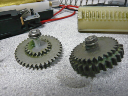 左がスパーギヤ、右がセクターギヤ。スパーギヤはベベルギヤから減速して伝わった回転を今度はちょっと増速してセクターギヤへ伝えます。これも歯車部分にグリスが付いていない・・・