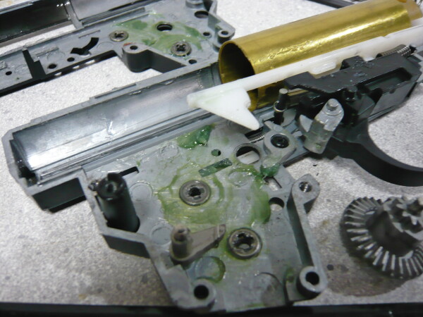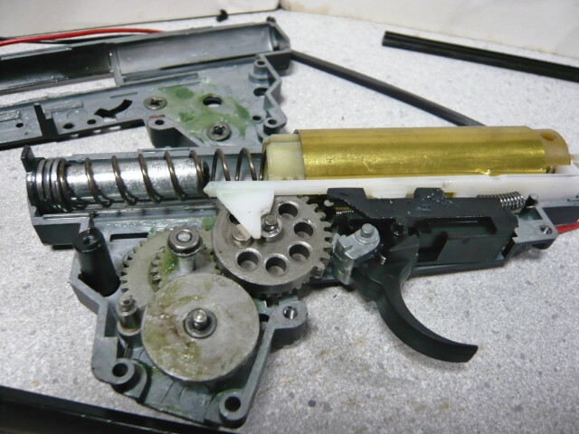 歯車へちゃんと乗るように塗って組みつけてゆきます。上画像は間違いだらけなので真似しないように。閉めた後でググって調べたところ、メカボックスの穴とメタルの間は接着してしまうレベルで、ここにグリスは付けないそうです・・・そしてピストン周辺にもつけちゃってますが、ここもダメ。セラミックグリスならそんなでもありませんが、ここはピストン用の低粘度グリスかシリコンオイルが正しいようです。ここへ高粘度グリスを塗ると抵抗になって破損してしまいます。