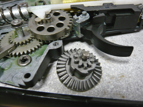電動ガンのメカボックス内をいじる上でパーツの名前は覚えておかないといけません。まずはこの裏側に放射状にギヤがあり波のような歯車のあるものがベベルギヤ。モーターの軸に付いているピニオンギヤの回転を減速してスパーギヤに伝え、波状のギヤには逆転防止ラッチが掛かって逆回転しないようにしています。ピニオンギヤとの噛み合わせ部分にグリスが全く付いていません・・・