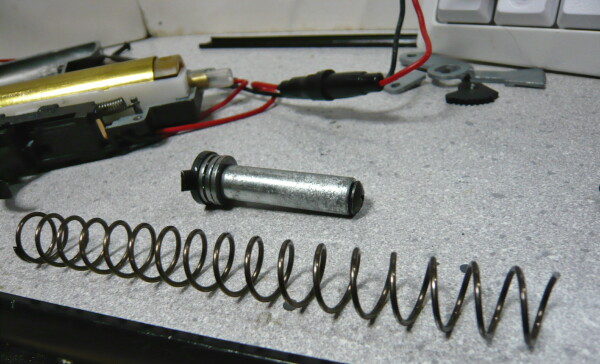 スプリングとスプリングガイド。スプリングはちょん切りデチューンがされています。中国製の電動ガンの場合現地で切ってデチューンしてからでないと日本国内に持ち込めないし、CYMAなどは世界中へ輸出しているのでわざわざ仕向け地用のスプリングを用意するよりはこうしてコストを下げています。気になる人は換えてしまえば良し。スプリングガイドは後ろ側にベアリングが付いていてスプリングが接触しながら回転する部分のフリクションを低減していますが、手でその前にある銀色をした筒を回すとあまりスムーズではありません。ここもアフターパーツが豊富にあるので換えても良いですが、このままでダメってわけでも無いので使う人の考えとお財布次第。