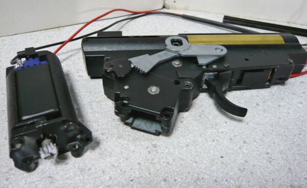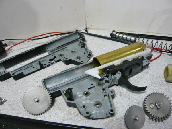 電動ガンのメカボックス内はタボールしか生で見た事が無いのですが、タボールのメカボックス内に較べるとパーツがゴツくて見た目には強そうに見えます。