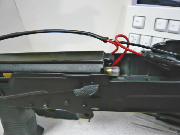 GP552は充電したら2500mAhくらい入りました。AN/PEQ-2タイプバッテリーボックスのライトが入る所のレンズを外したら突き出ながらも一応入るのでこんな形にしてやりました。プローブというか、センサー棒というか・・・さすがに容量が大きいだけの事はあり作動は元気があります。