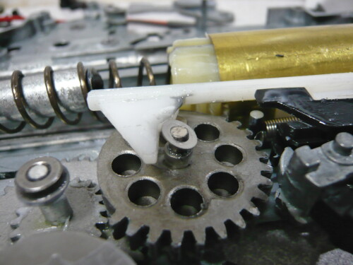 上画像の中央上から右へかけて伸びている白いパーツが前述のタペットプレート。プラスチック製でグニャグニャしているのでつい強化したくなりますがこのパーツはある程度柔らかくないとすぐ割れるそうです。このパーツも組み付け時には定位置があり、セクターギヤに付いているセクターチップより後ろ側へ掛けて、その位置で押さえながらでないとメカボックスが締められないというちょっとクセのあるパーツ。