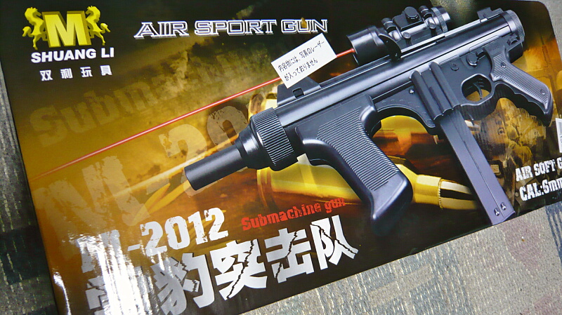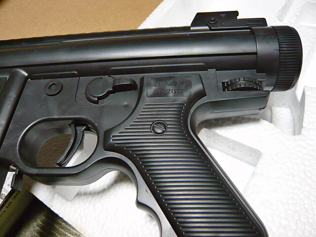 箱の文字がいかにも中国製。そういや中華エアコキの外箱の写真では多くがレーザーポインターを装備してますが、あちらでは流行ってるんでしょうか?もっとも、日本ではレーザーポインターは今世紀に入ってから規制されてしまったのでほとんど入ってくる事はないでしょう・・・