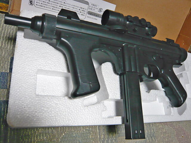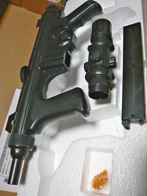 スコープとマガジンを装着。ストックは無いのでMP5Kのように前後にあるグリップを両手でそれぞれ握って構えます。軽いのでハンドガン持ちでもOK。