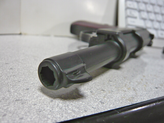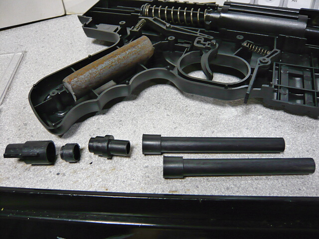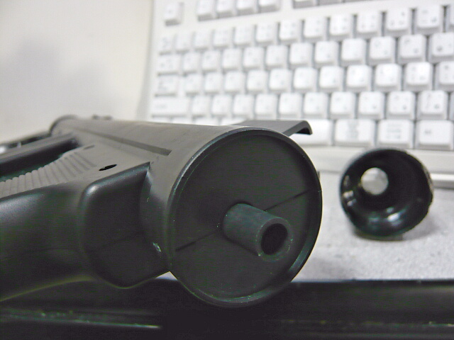 フロントサイトが付いているマズル部分は別パーツで、左右モナカなアウターバレルの先端にはめこまれておりライフリング表現もあります。でも丸溝で8条もあり、こんなんだっけ?
