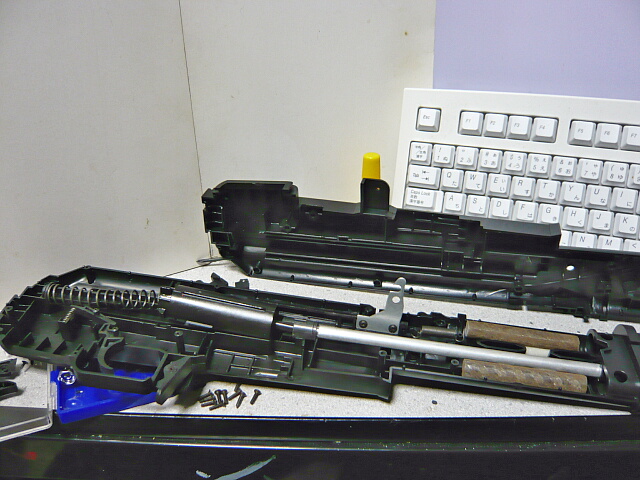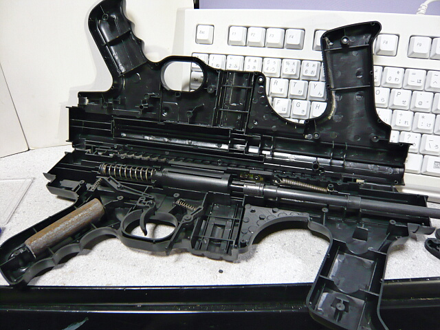 グリップは右側のネジ2個を外しコリコリ拡げて外します。中にはおなじみの錆鉄棒。グリップとレシーバーの結合は上端で挟まってるだけ。