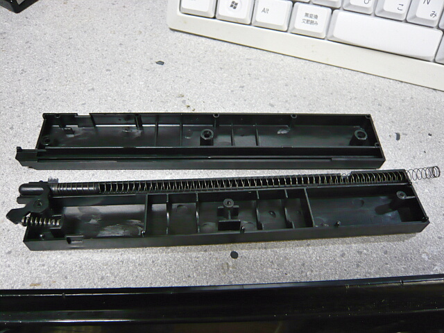 重りでも入れられないかな?とマガジンもバラしてみました。マガジンはフォロワーが露出してる列だけを使用する単純な構造で、リザーブはありません。ここもウェイトがはいりそうな形状が作ってあるだけで空っぽです。鉛ウェイトならそこそこ入るスペースですが、やっぱり軽いままでいいや、と今回はそのまま組みなおしました。
