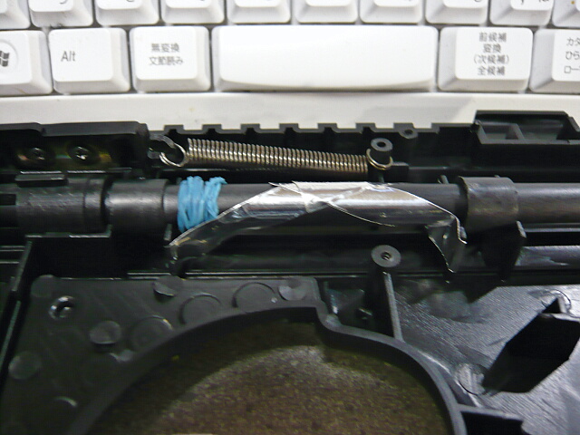今回はパフォーマンス向上としてホップアップ機構を付加します。インナーバレルのチャンバーに程近い周りに干渉するものが無い位置を利用し、上側にノコギリで幅1mmほどの切れ目を入れます。真っ直ぐ切り込んだ時貫通した穴の長さが3mmくらいかな?削りカスはきれいに取り除いておきます。そしてインナーバレル内にちょっとだけ出るように輪ゴムを巻きます。切り込みの位置が真上になるように組み付け、バレルが回転して位置がずれないよう上画像のようにアルミテープなどで銃側に固定します。あとは銃を組み上げれば固定ホップアップ機構付きベレッタM12S完成。