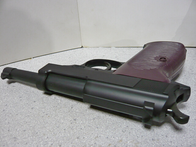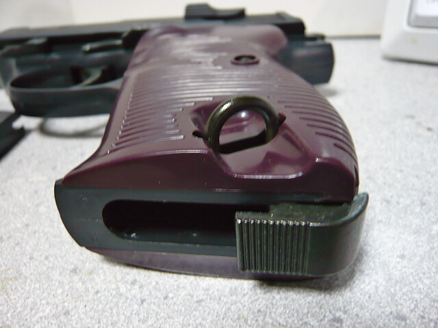 グリップは握った感じが前後に細長い印象で、幅が薄いスリムな握り心地。グリップパネルは色がぶどう色というかマルーンというか・・・ちょっと好みの分かれるところかも知れません。ネジは右側がダミーで、多分左側のネジがフレームを貫通して右側グリップパネルの内側に刺さってるんだろうと思います。左側グリップパネルにはランヤードリングが突き出ており、ここは金属製ですが根元はややグラついています。マガジンキャッチは金属製のヨーロピアンタイプというか、いわゆるグリップ下面に付いてマガジンをしっかり掴みながらリロードするタイプ。ただこのタイプはウチにある銃では他にイングラムM11しかなく、動作方向が逆なのでちょっと戸惑います。底面から親指で後ろ側へ押してロック解除。マガジンを挿す時もリップ後ろ側で押してやる必要がありちょっと使いにくい・・・片手でマガジンを抜くのは無理です。