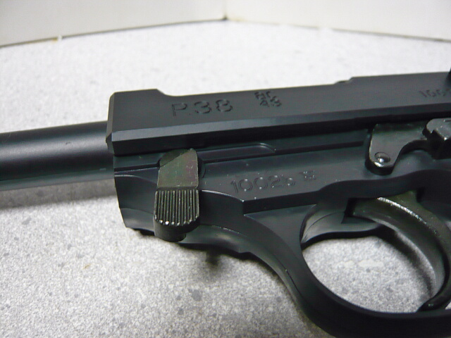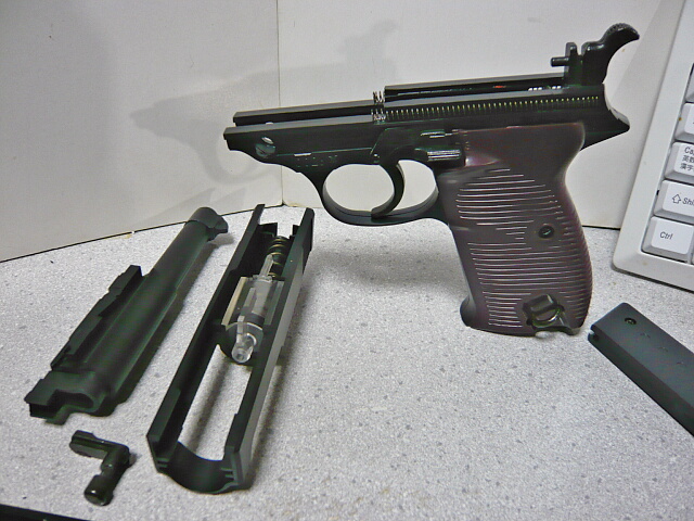 外観的にはワルサーP38の特徴はおさえられていて、ところどころ金属パーツになっています。露出したアウターバレルやフレームの中央の分割があまり処理しきれていなかったり、左側にプラスネジが見えたりとちょっと残念な部分もあれど、この値段なら些細な事でしょう。