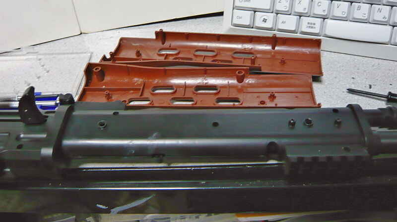 ハンドガードは左右からはめ込まれているだけ。黄河ドラグノフみたいにレイルのネジが噛みこんでたりはせず、単純に左右にはずせます。上下左右からグッと握るとどこかしらスキマが開くのでそこへ精密ドライバーのマイナスを突っ込んでコリコリ丁寧に拡げてはずします。
