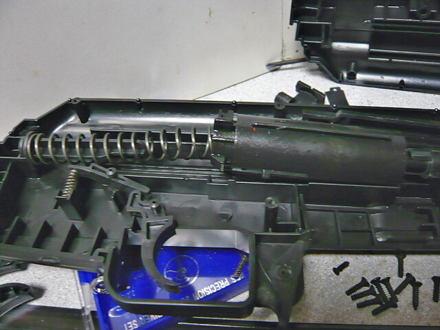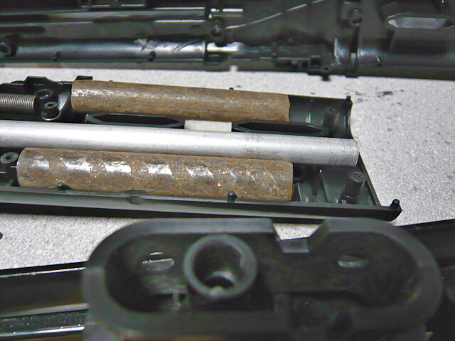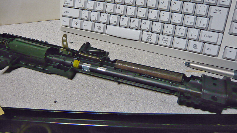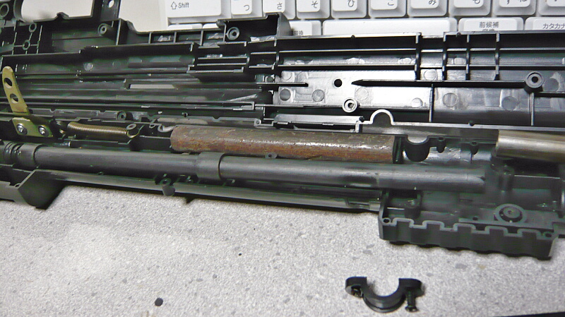 ハンドガード内に位置する部分にはプラ製の2分割されたインナーバレルが通っており、上半分には錆鉄棒のウェイト。細くてスペースが少ないのでウェイト増量は厳しいか。
