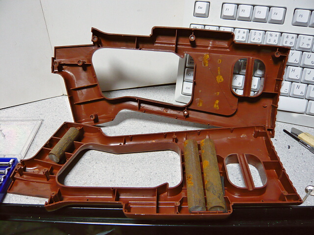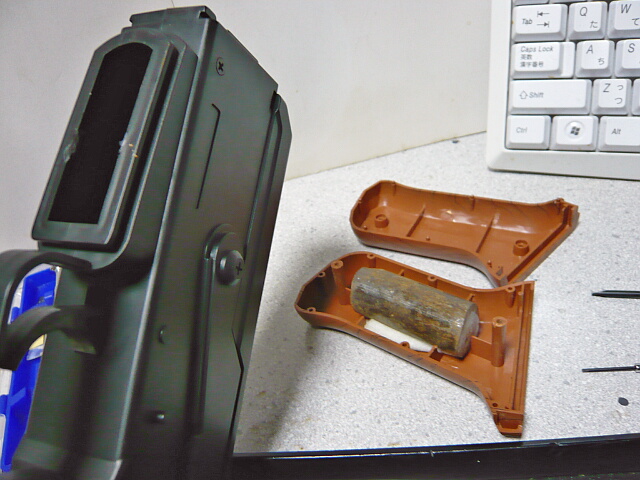 右側面に見えるネジを全て抜くとシンプルに左右に分かれます。面倒なところは特になし。後ろ側グリップ内にのみ錆鉄棒ウェイトが入っています。前側グリップ内にもスペースはありますが、こちらは空でした。