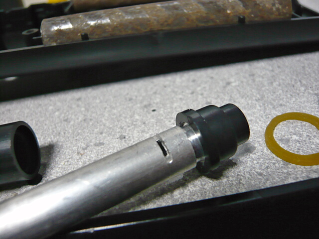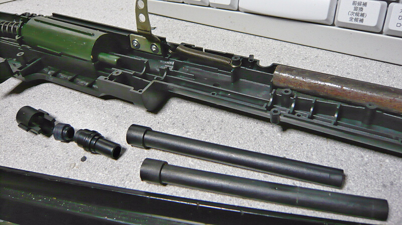 インナーバレルとチャンバー。インナーバレルはハンドガード先端までの長さ。ホップアップは無いので今回はお手軽ホップアップ化改造をしておきます。