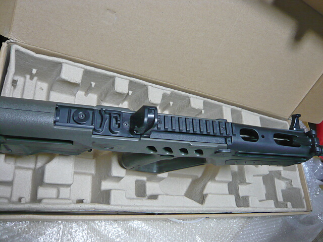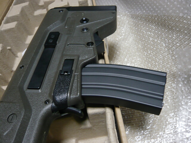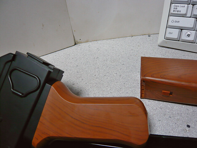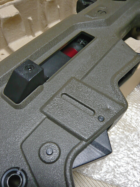 写真を撮り忘れましたがトリガー後ろグリップ付け根にあるセレクターはセーフが9時、セミが12時、フルが1時半くらいで、動作はカッチリしています。レバーは左側だけで、右側には表示だけ。パーツを付け替える事で左右を入れ替えられそうな気がします(エジェクションポートやコッキングハンドルも同様ですが、実際に入れ替えられるかはわかりません)。