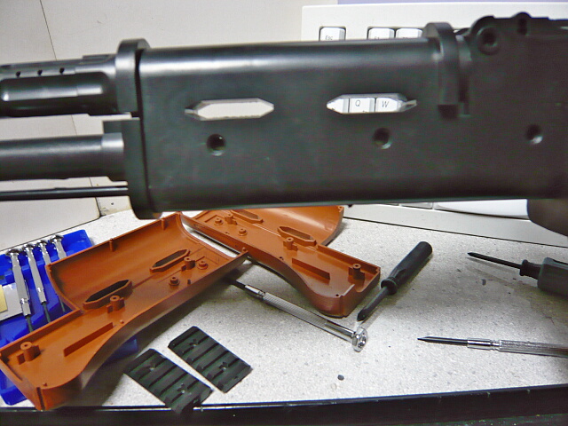 残った黒いパーツは右側面に見えるネジを全て外してゆきます。スリングスイベルとして付いているチャチな金具も左右固定のネジとして機能しているので忘れずに外します。ストックのネジと黒いパーツのネジは若干長さが違うので間違わないように分類しておいた方が間違いがありません。