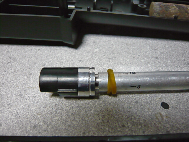 プラ製インナーバレルはノコギリが入れやすくて楽・・・幅1mm貫通する穴の長さ3~4mm程度にノコギリで切り込みを入れて輪ゴムを巻きます。いつもの手順。切り込みが真上にくるように組んでアルミテープで回らないよう固定。