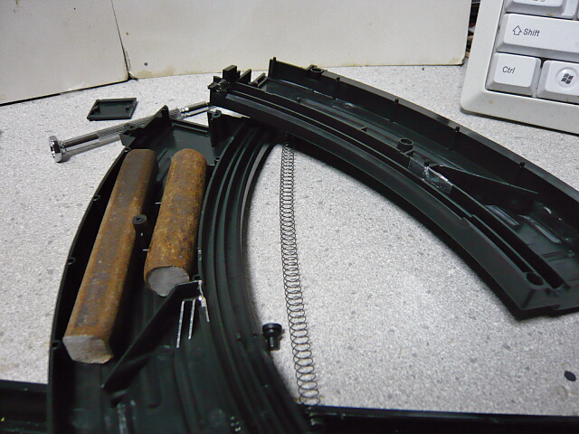 リザーブとマガジン本線はアルミテープで塞いで隔離。リザーブスペースにはL85A2に入ってた錆鉄棒を一本追加。このマガジンはリップ部分のストッパーが独特な形で押さえにくく弾を込めにくいのでフォロワーを一番下でロックできると便利。
