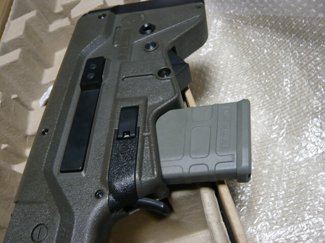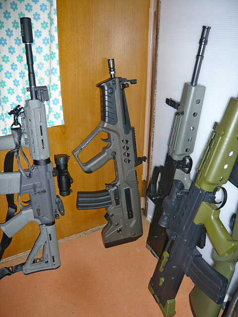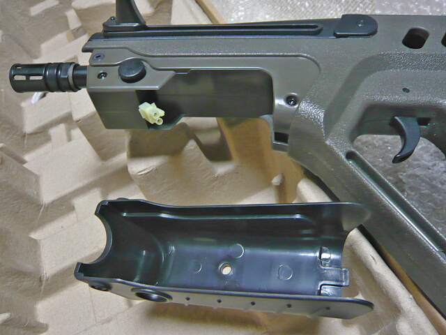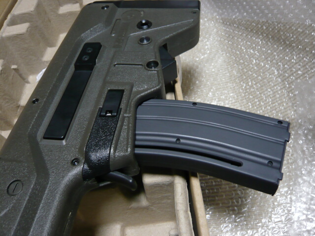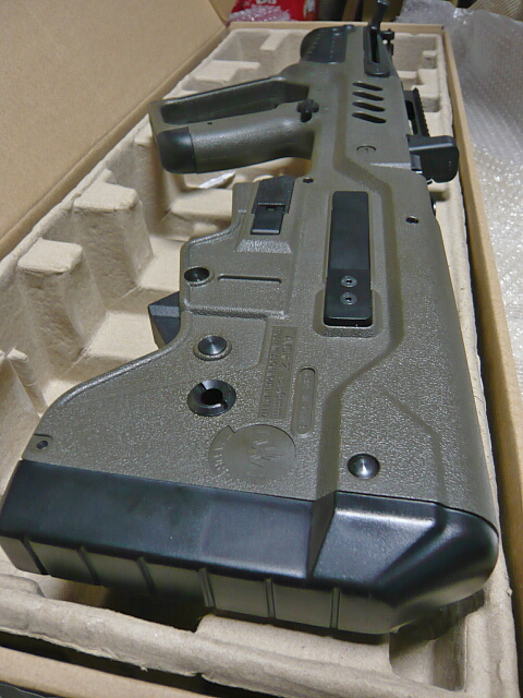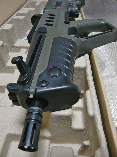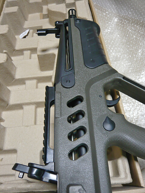 ブルパップ銃としてはごく最近のものなのでさすがに使い易くできています。全長はストックを縮めたM4CQBと同じくらいでしょうか。重量バランスはさすがに後ろ寄りですが、非常に構え心地が良いです。一方で拡張性・・・上にレイルがあるので光学サイトの取り付けには困りませんが、あまり取り付け部がガッチリしていないので神経質な人には気になって仕方がないかも。あとこの銃にはスリングスイベルが無く、この辺りどうしたらいいんでしょう?ストック部の左右にある穴はQDスイベル穴かと思ったら若干小さい穴でした。