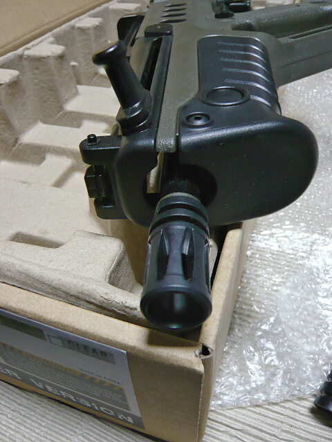 全体的にプラスチック製パーツで構成されています。フラッシュハイダーは穴が2・4・8・10時の方向に開いており、これもプラスチック製。ハンドガードやバットプレートはツヤのあるプラ製。コッキングハンドルが取り付いているレシーバー上面もほぼプラ製です。ただ剛性はちゃんとあり安い中華エアコキなんかの品質ではありません。