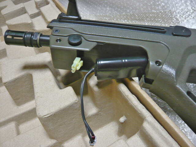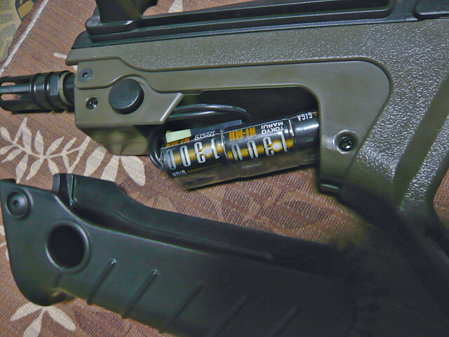 ハンドガード左側面の丸ボタンを押しながらハンドガードを下へ引くとハンドガードがはずれます。バッテリーはここに入ります。コネクターはミニバッテリー用で、配線が短い・・・