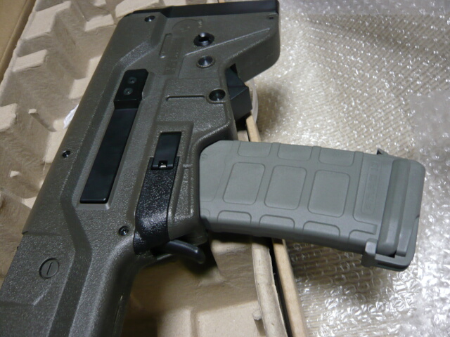 開封。思ってたよりオリーブドラブは暗い色です。内容は銃本体とマガジン、そして説明書の3点のみ。必要最小限のものだけが入っています。