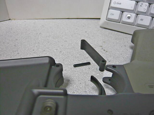 グリップ側の軸はスプリングピンで保持されており、片側からポンチで叩いてピンを抜くとトリガーガードが外れます。トリガーガードは金属製で、結構な重さがあります。