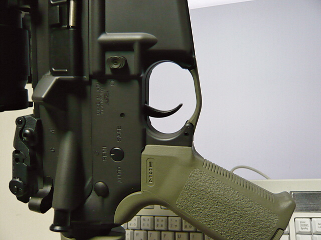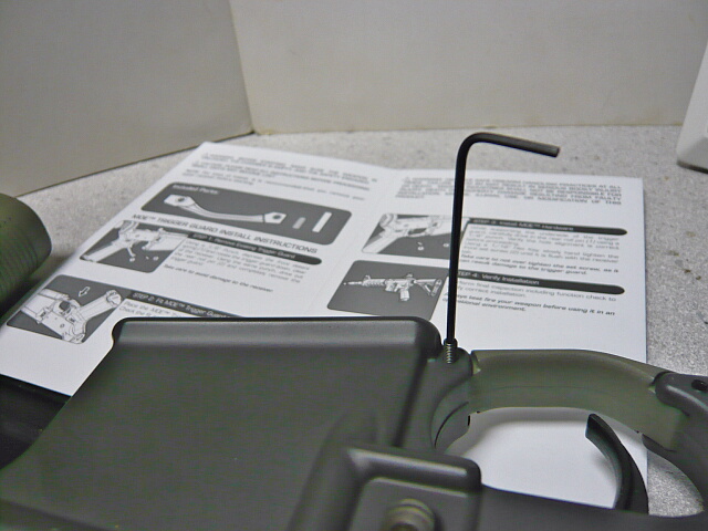 MOEトリガーガードを取り付けます。元々このマルイのスタンダード電動M4のためのパーツなので幅も長さもピッタリ。トイスターのM4に合わせてみたら幅が1mmほど大きかったので、あちらは幅の狭いWAガスブロM4用が合うのだろうと思います。付属のスプリングピンは拡がっているのでペンチで締めてから差し込んだ方がスムーズ。グリップ側にピンを入れると上画像のようにちょっとしか動かなくなりますが、このトリガーガードは元々動かす機能をオミットして考えているようです。