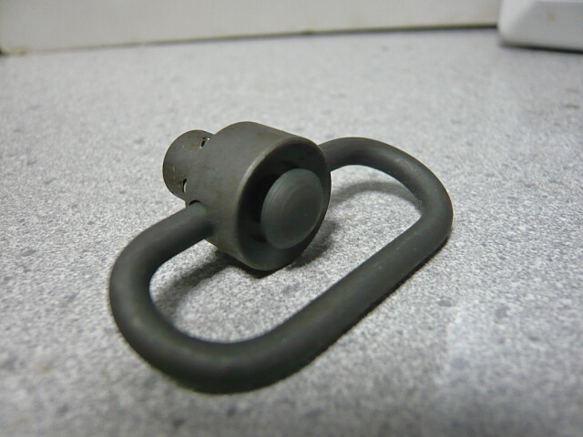QDスイベルはQDスイベル穴が開いてるパーツがあればワンタッチで取り付く便利なスリングスイベルです。軸の上にあるボタンを押し込むと軸の周囲のベアリングがフリーになり、離すとベアリングが外側へ出っ張った状態でロックされるしくみ。ただこのスイベル、パーカー処理なんでしょうが錆びてるようにも・・・