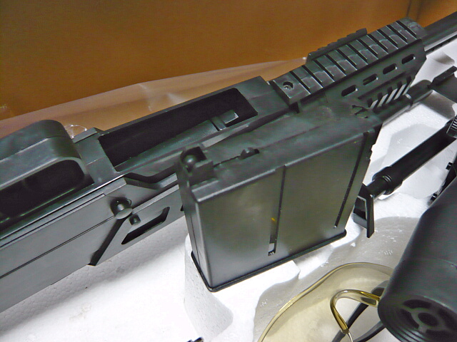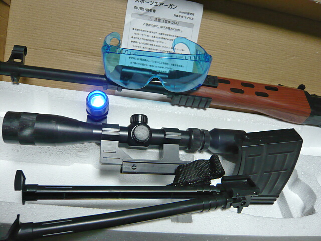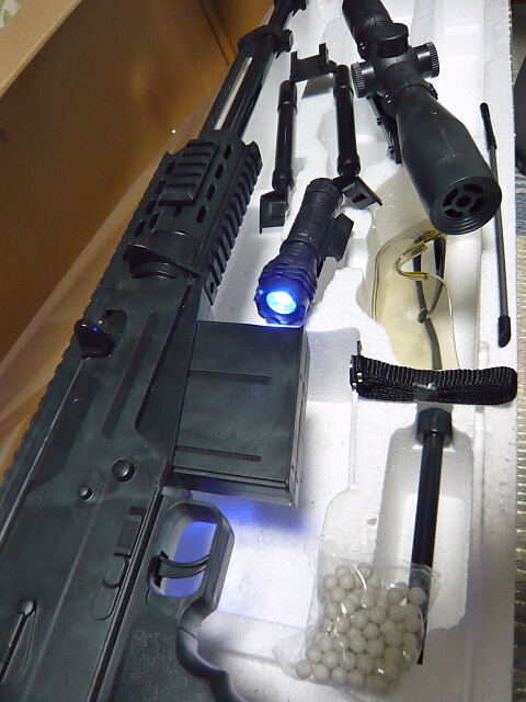 付属品はバイポッド(ペナペナで軽い)にスコープ(ただの筒)にライト(電池入り・結構明るい)にBB弾(ゲート跡あり0.12gくらい)にスリング(幅1cm・・・)にゴーグル(前に何かに付いてたのと同じ)にクリーニングロッド(10cmくらいしかないんですが・・・)に何かよく分からない筒。ローダー?