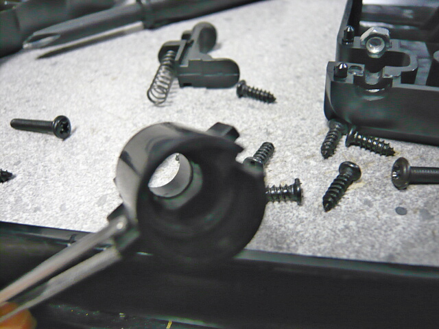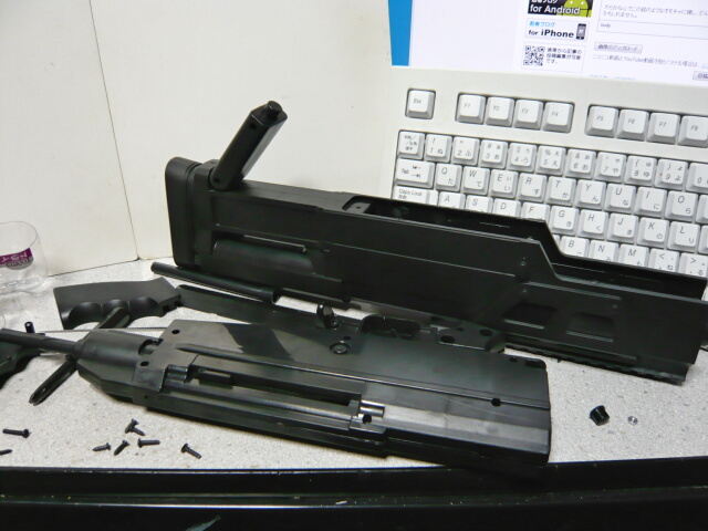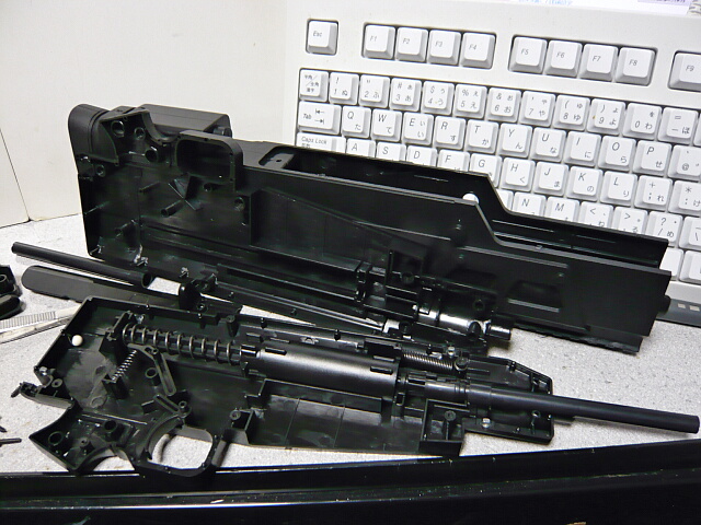 左右ハメコミされてるだけなグリップを外してグリップ付け根後ろと前半部分を繋いでるレシーバー前方上下の3本のネジを抜き、銃前半を引っこ抜きます。機関部はレシーバーに挟まってるだけなのでコッキングレバーのネジ一本をはずし、左右に拡げて機関部を引っ張り出します。
