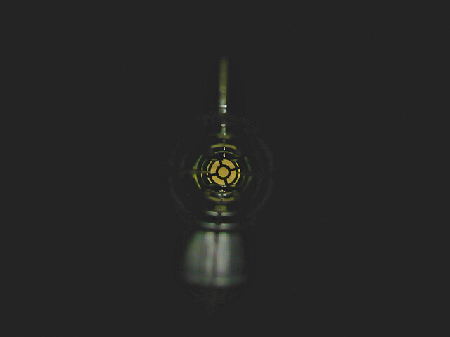 スコープを覗くとこんな感じ。アイアンサイトは付いているのですが位置が低く使えないのでこの筒スコープ頼み。上にスキマが開いています・・・